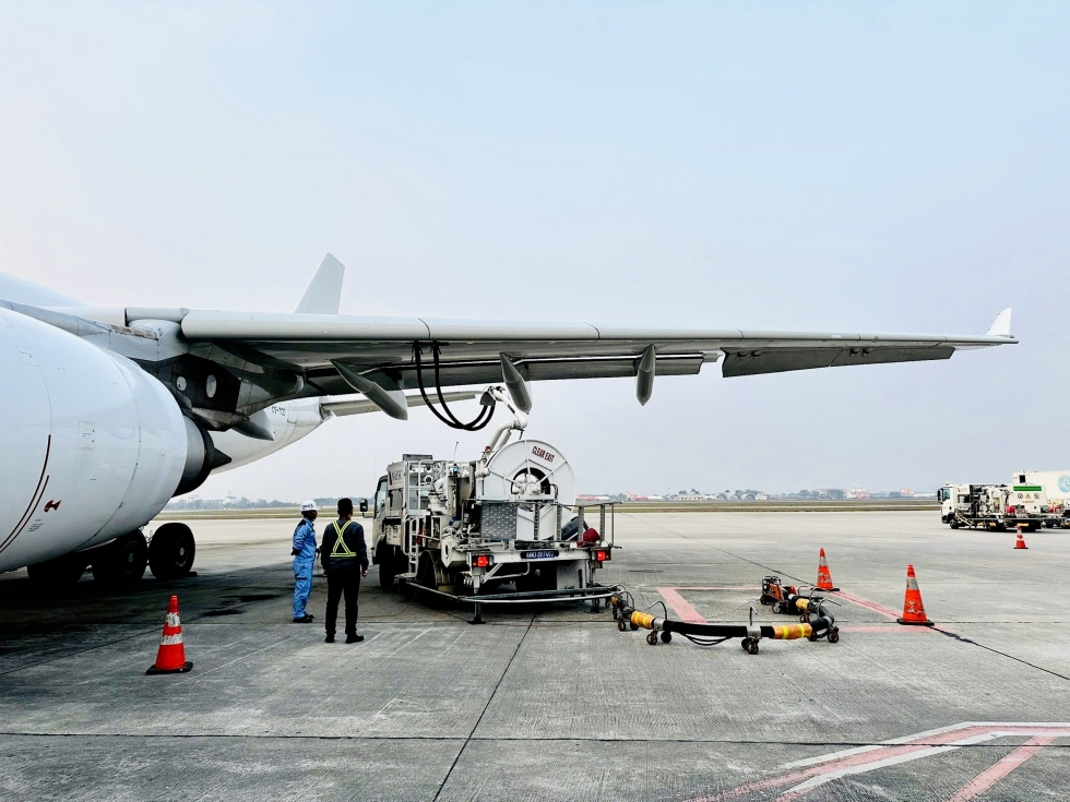 SKYPEC Northern Region Branch coordinating with ground operations staff to inspect technical parameters and ensure safety during refueling operations.
