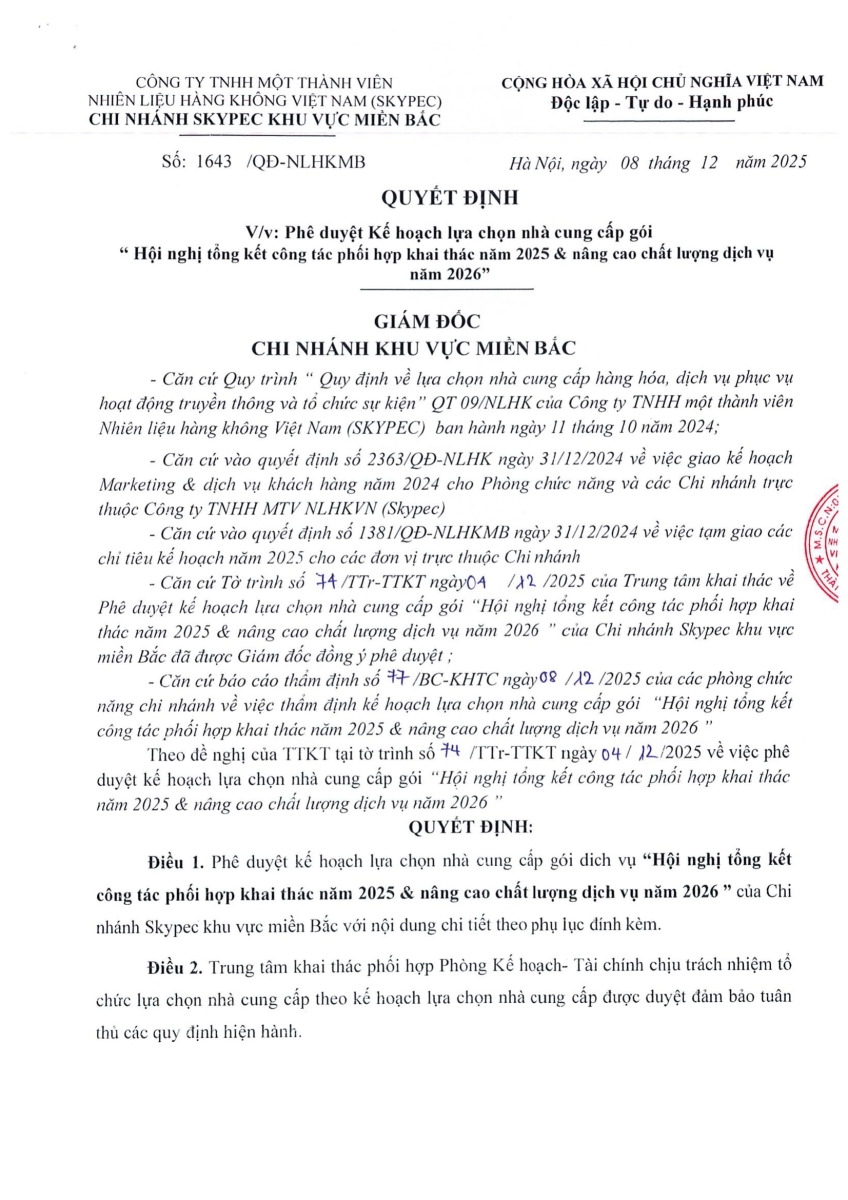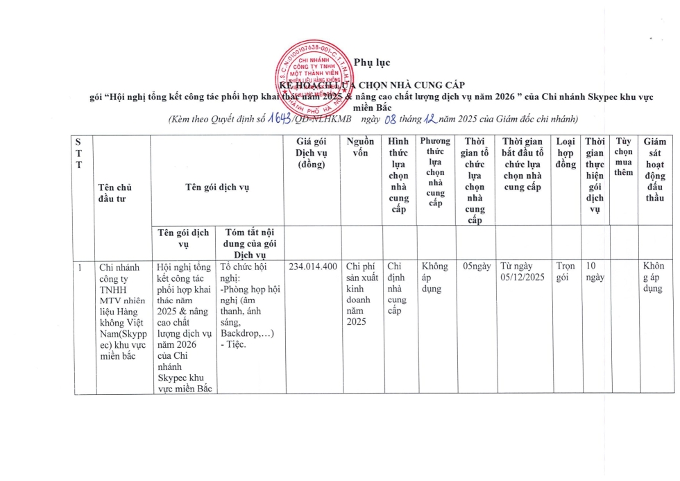 PHÊ DUYỆT KẾT QUẢ LỰA CHỌN NHÀ CUNG CẤP GÓI: HỘI NGHỊ TỔNG KẾT CÔNG TÁC PHỐI HỢP KHAI THÁC NĂM 2025 & NÂNG CAO CHẤT LƯỢNG DỊCH VỤ NĂM 2026