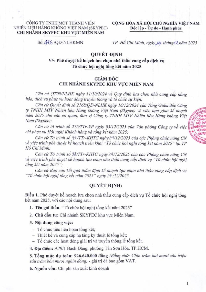 QUYẾT ĐỊNH PHÊ DUYỆT KẾT QUẢ LỰA CHỌN NHÀ THẦU CUNG CẤP DỊCH VỤ GÓI THẦU SỐ 3: TỔ CHỨC CÁC HOẠT ĐỘNG GIẢI TRÍ VÀ TRUYỀN THÔNG LỄ TỔNG KẾT CNKVMN