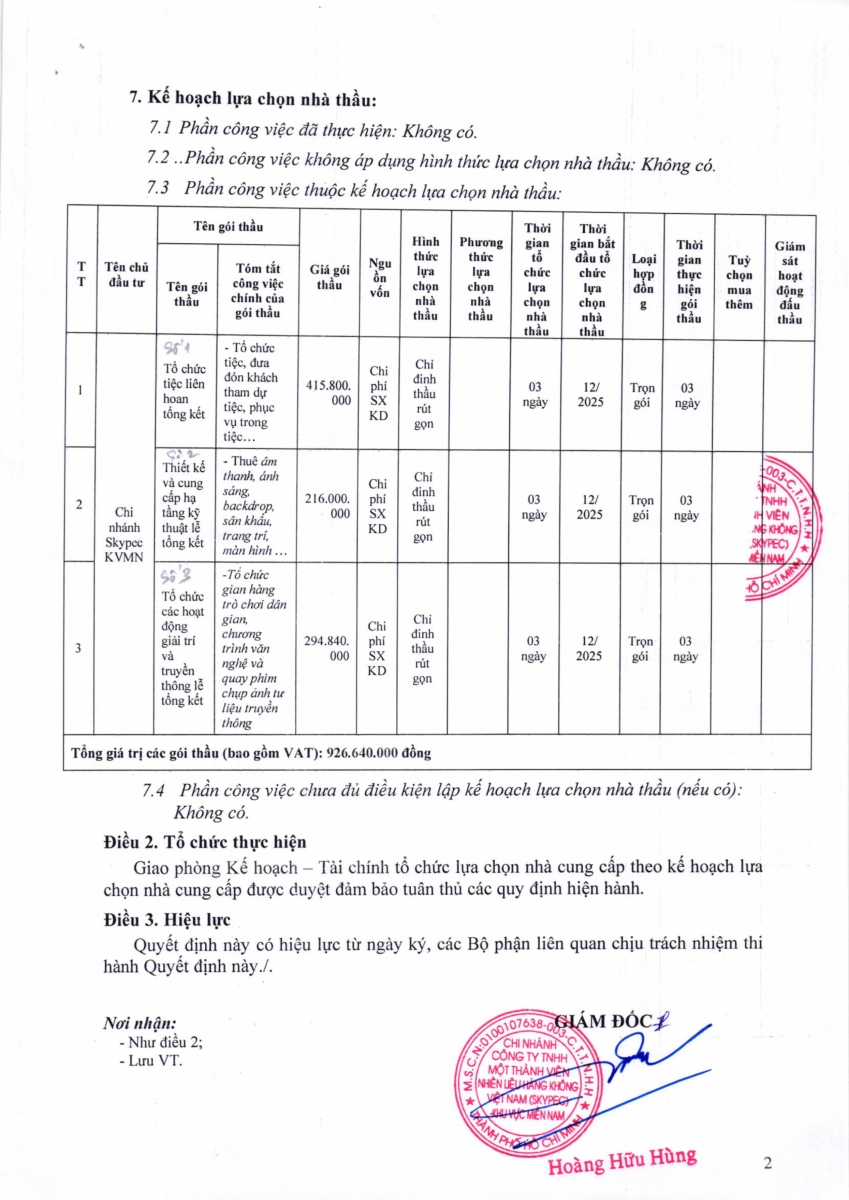 QUYẾT ĐỊNH PHÊ DUYỆT KẾT QUẢ LỰA CHỌN NHÀ THẦU CUNG CẤP DỊCH VỤ GÓI THẦU SỐ 2: THIẾT KẾ VÀ CUNG CẤP HẠ TẦNG KỸ THUẬT LỄ TỔNG KẾT CNKVMN