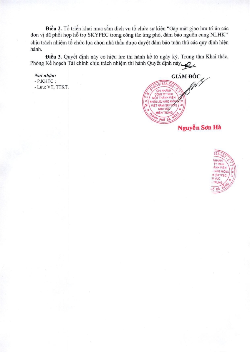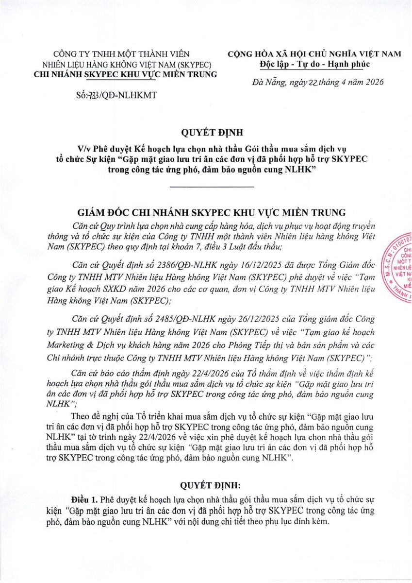 QUYẾT ĐỊNH PHÊ DUYỆT KẾ HOẠCH LỰA CHỌN NHÀ CUNG CẤP GÓI DỊCH VỤ: TỔ CHỨC GẶP MẶT CÁC ĐƠN VỊ TẠI CẢNG HKQT NỘI BÀI VÀ THỐNG NHẤT CÔNG TÁC PHỐI HỢP PHỤC VỤ CAO ĐIỂM TẾT NGUYÊN ĐÁN