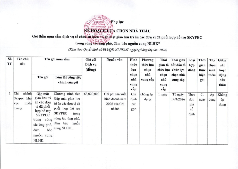QUYẾT ĐỊNH PHÊ DUYỆT KẾ HOẠCH LỰA CHỌN NHÀ THẦU CUNG CẤP DỊCH VỤ GÓI THẦU: TỔ CHỨC SƠ KẾT CAO ĐIỂM ĐẦU NĂM 2026