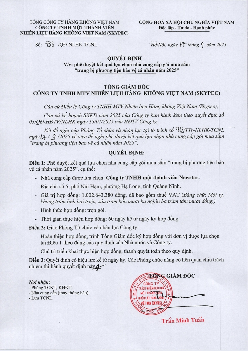 PHÊ DUYỆT KẾT QUẢ LỰA CHỌN NHÀ CUNG CẤP GÓI MUA SẮM: TRANG BỊ PHƯƠNG TIỆN BẢO VỆ CÁ NHÂN NĂM 2025