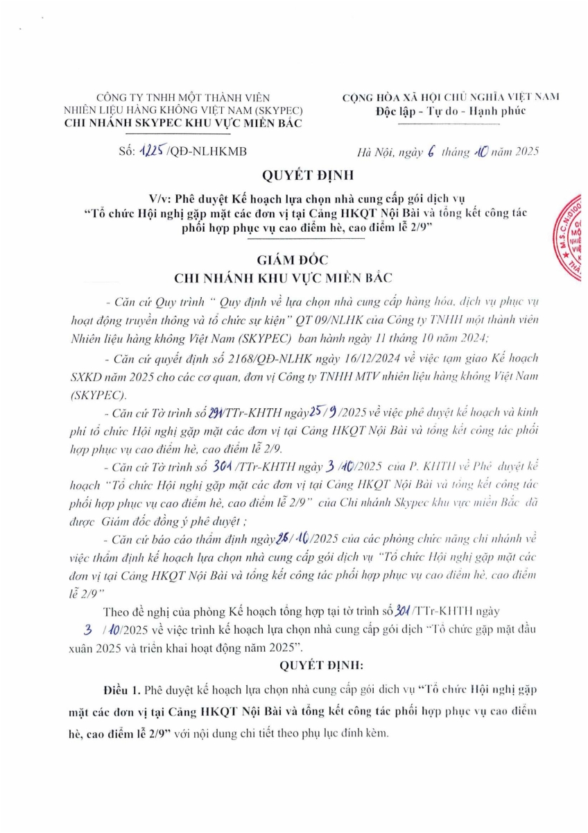 QUYẾT ĐỊNH PHÊ DUYỆT KẾ HOẠCH LỰA CHỌN NHÀ CUNG CẤP GÓI DỊCH VỤ: TỔ CHỨC HỘI NGHỊ GẶP MẶT CÁC ĐƠN VỊ TẠI CẢNG HKQT NỘI BÀI VÀ TỔNG KẾT CÔNG TÁC PHỐI HỢP PHỤC VỤ CAO ĐIỂM HÈ, CAO ĐIỂM LỄ 2/9