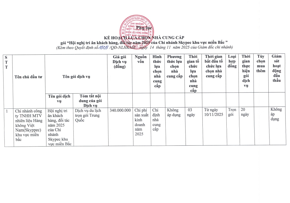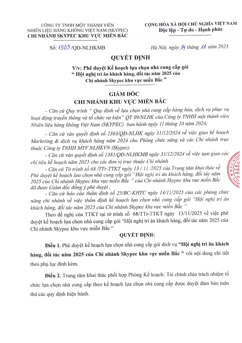 QUYẾT ĐỊNH PHÊ DUYỆT KẾT QUẢ LỰA CHỌN NHÀ CUNG CẤP GÓI DỊCH VỤ: TỔ CHỨC HỘI NGHỊ GẶP MẶT CÁC ĐƠN VỊ TẠI CẢNG HKQT NỘI BÀI VÀ TỔNG KẾT CÔNG TÁC PHỐI HỢP PHỤC VỤ CAO ĐIỂM HÈ, CAO ĐIỂM LỄ 2/9
