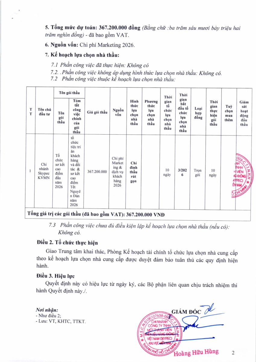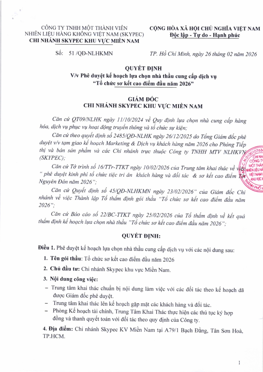 QUYẾT ĐỊNH PHÊ DUYỆT KẾT QUẢ LỰA CHỌN NHÀ THẦU CUNG CẤP DỊCH VỤ GÓI THẦU: TỔ CHỨC SƠ KẾT CAO ĐIỂM ĐẦU NĂM 2026