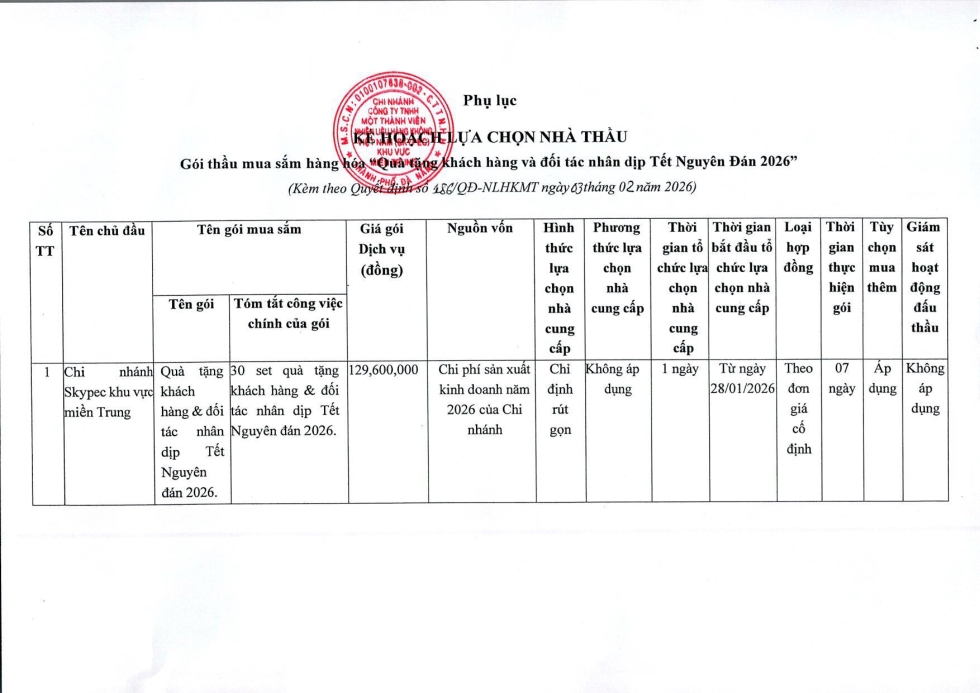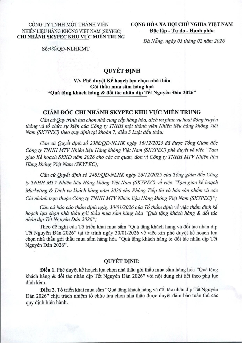 QUYẾT ĐỊNH PHÊ DUYỆT KẾ HOẠCH LỰA CHỌN NHÀ THẦU GÓI MUA SẮM HÀNG HÓA: QUÀ TẶNG KHÁCH HÀNG VÀ ĐỔI TÁC NHÂN DỊP TẾT NGUYÊN ĐÁN 2026