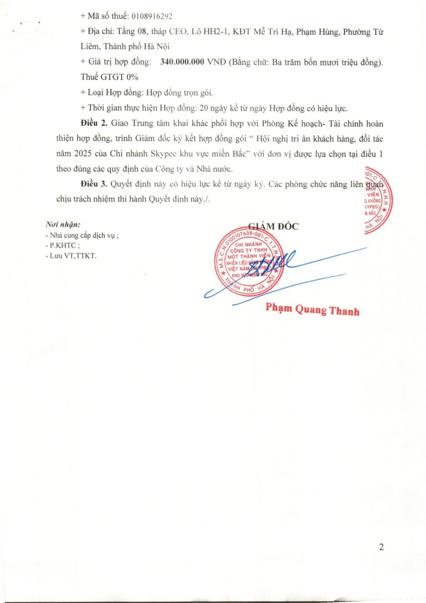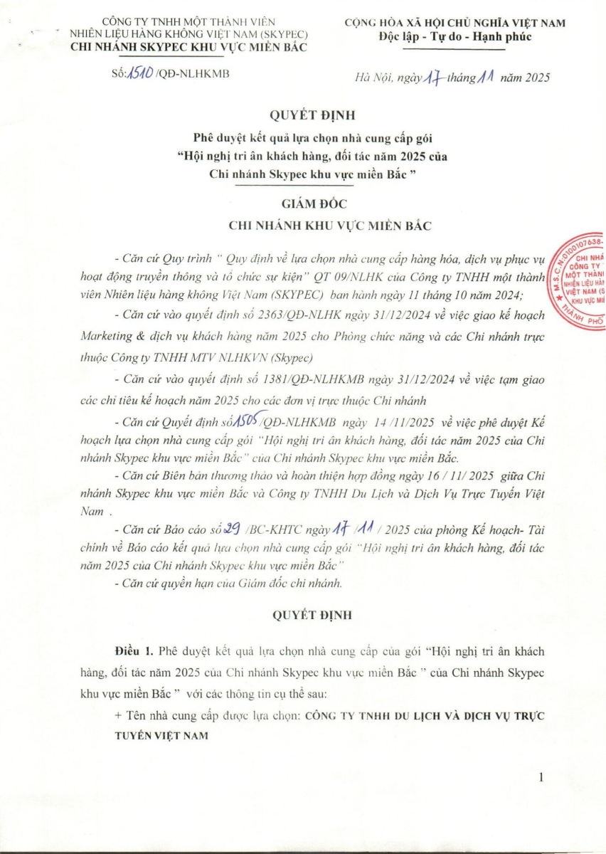 QUYẾT ĐỊNH PHÊ DUYỆT KẾ HOẠCH LỰA CHỌN NHÀ CUNG CẤP GÓI: HỘI NGHỊ TRI ÂN KHÁCH HÀNG, ĐỐI TÁC NĂM 2025 CỦA CHI NHÁNH SKYPEC KV MIỀN BẮC