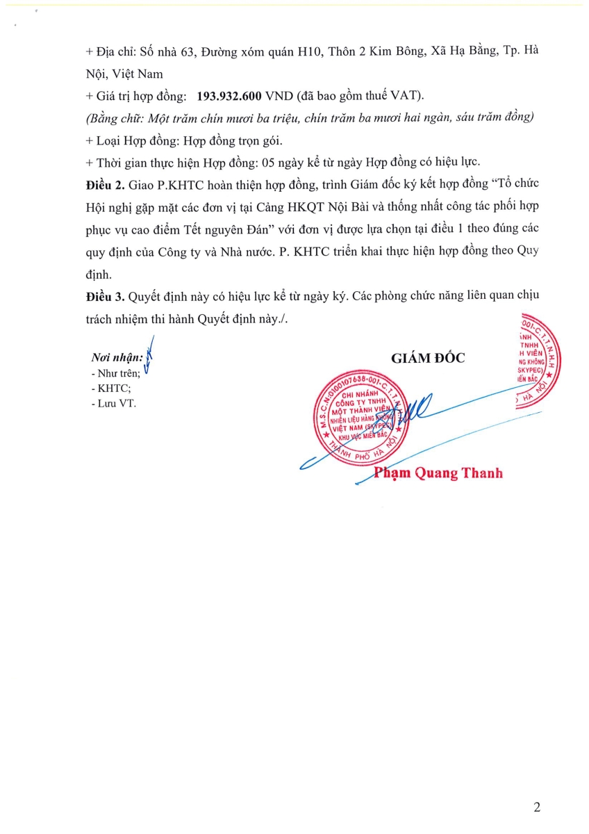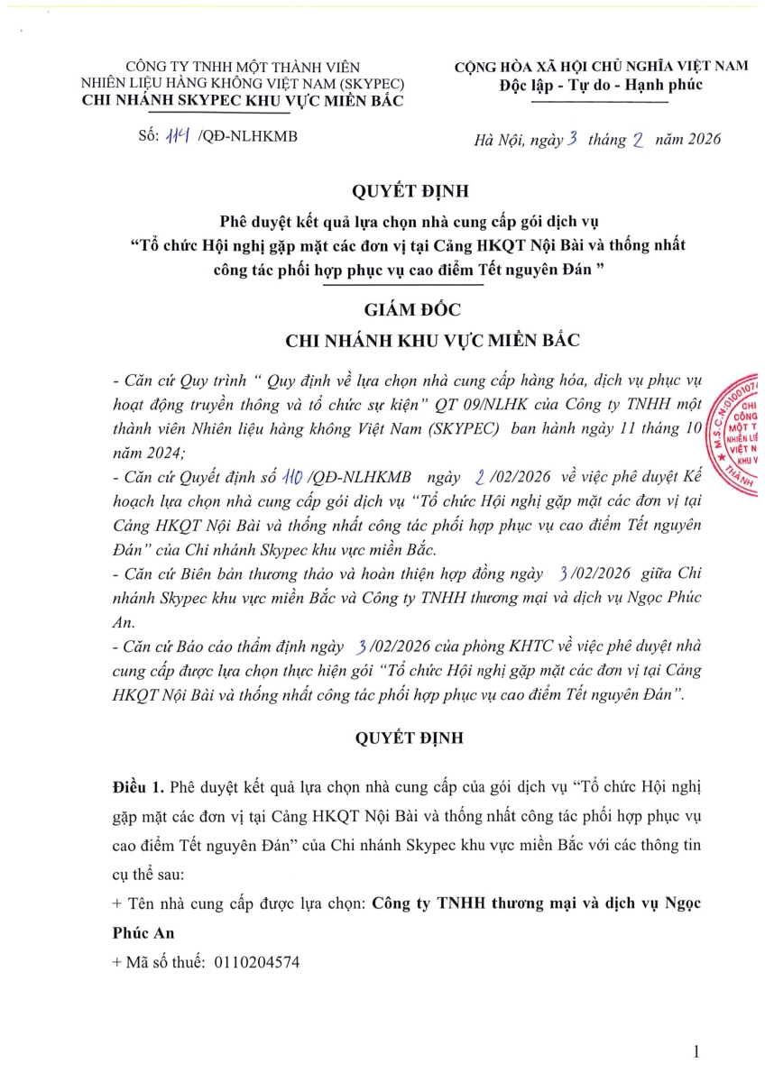 QUYẾT ĐỊNH PHÊ DUYỆT KẾ HOẠCH LỰA CHỌN NHÀ CUNG CẤP GÓI DỊCH VỤ: TỔ CHỨC GẶP MẶT CÁC ĐƠN VỊ TẠI CẢNG HKQT NỘI BÀI VÀ THỐNG NHẤT CÔNG TÁC PHỐI HỢP PHỤC VỤ CAO ĐIỂM TẾT NGUYÊN ĐÁN