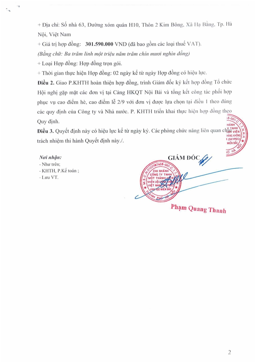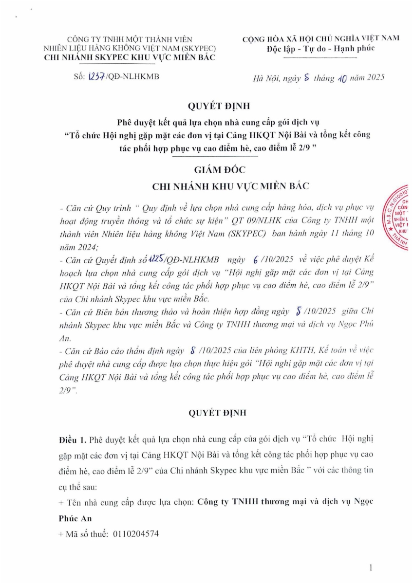 QUYẾT ĐỊNH PHÊ DUYỆT KẾT QUẢ LỰA CHỌN NHÀ CUNG CẤP GÓI DỊCH VỤ: TỔ CHỨC HỘI NGHỊ GẶP MẶT CÁC ĐƠN VỊ TẠI CẢNG HKQT NỘI BÀI VÀ TỔNG KẾT CÔNG TÁC PHỐI HỢP PHỤC VỤ CAO ĐIỂM HÈ, CAO ĐIỂM LỄ 2/9