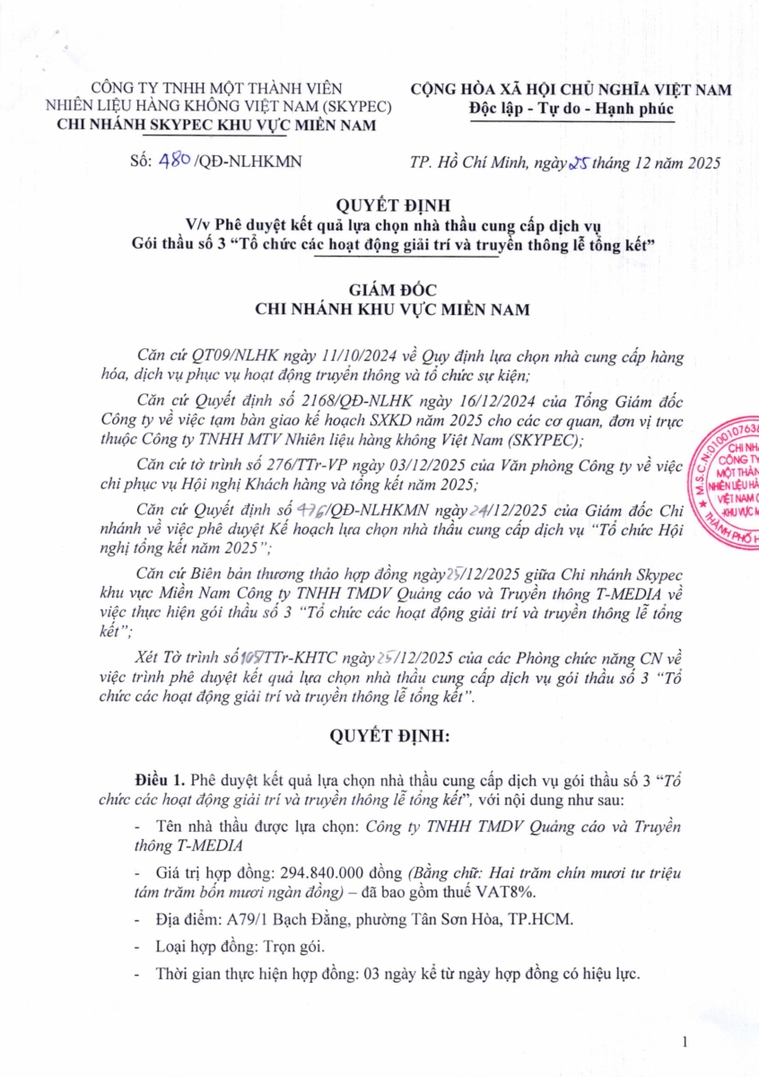 PHÊ DUYỆT KẾT QUẢ LỰA CHỌN NHÀ THẦU CUNG CẤP DỊCH VỤ TỔ CHỨC HỘI NGHỊ TỔNG KẾT NĂM 2025 CỦA CHI NHÁNH KV MIỀN NAM