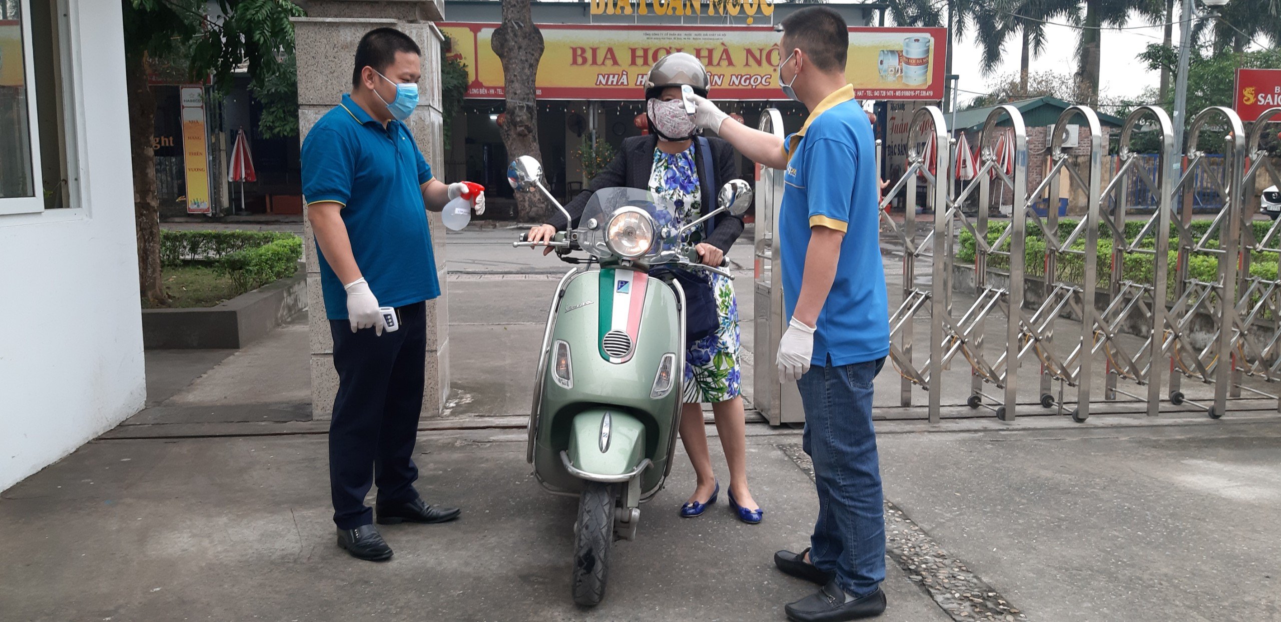 Tổ xung kích Đoàn thanh niên CNVT tiến hành phun khử trùng, vệ sinh lại nơi làm việc, đo thân nhiệt…
