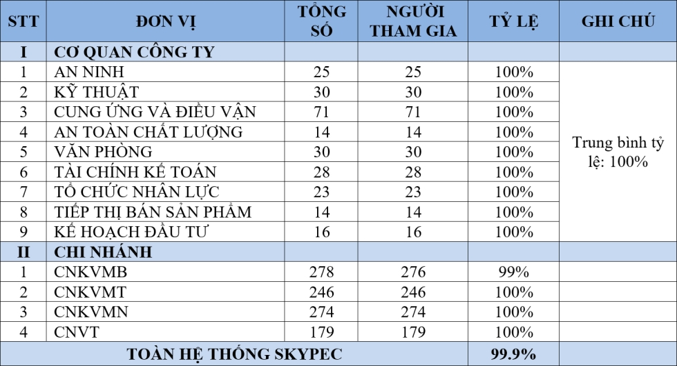 Skypec với sự quan tâm của Ban lãnh đạo, người đứng đầu các cơ quan, đơn vị và tâm huyết của toàn thể cán bộ, nhân viên đã gửi gắm những chia sẻ chân thực, thẳng thắn giúp lan tỏa tinh thần VHAT. Nâng cao ý nghĩa của chương trình khảo sát VHAT: 99,9% cán bộ, nhân viên Công ty tham gia khảo sát, đó không chỉ là một con số ấn tượng, mà còn là minh chứng cho sự đồng lòng, là niềm tin và là cam kết mạnh mẽ đối với an toàn, đồng thời là nền tảng cho sự phát triển trong hệ sinh thái chung của Vietnam Airlines.